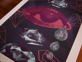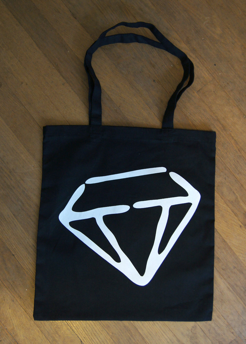 Black canvas tote bag with large white gem screen printed on both sides. Ships with bonus stickers and pins.